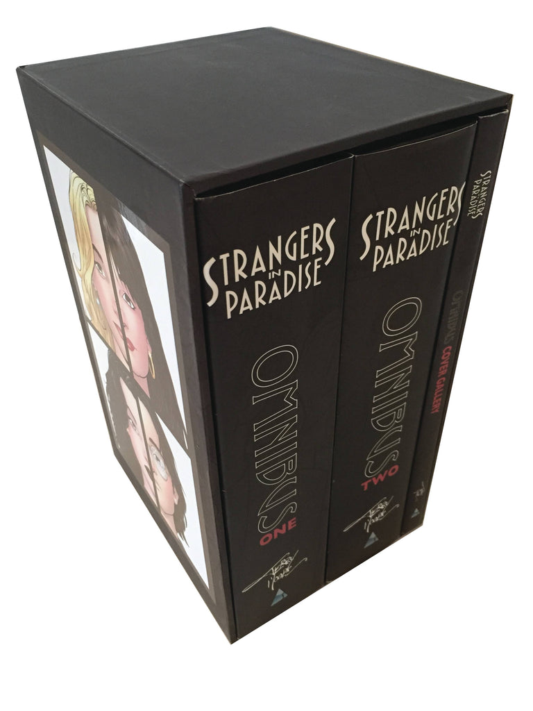 The Strangers In Paradise Omnibus softcover edition is back in print! This new printing of the Omnibus collects the entire series in two premium softcover volumes totaling 2,128 pages, housed in a gorgeous slipcase. Don't miss this chance to own an affordable version of the definitive SIP collection!